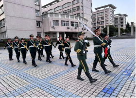晨过熹微,国旗护卫队迈着整齐的步伐出现在广场,随着庄严的《义勇军进行曲》响起,全体师生行注目礼,国旗在晨光中缓缓升起,现场氛围肃静庄严。