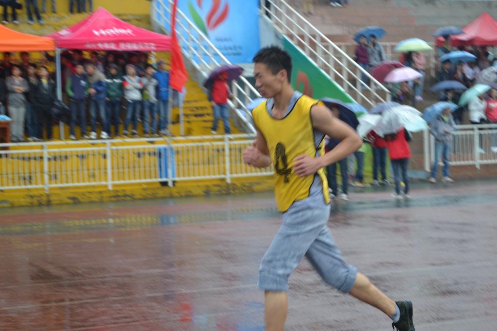 4月25日下午,在田径场进行了男子10000米跑步比赛,2013级李宏卫取得万米长跑第四名。