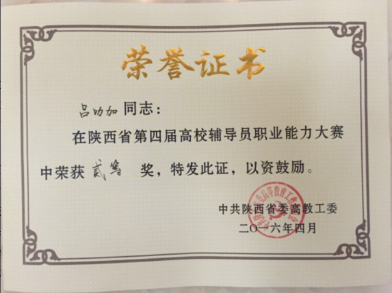 3月31至4月1日,由中共陕西省委高校工委、陕西省教育厅主办,西北大学承办的第四届陕西省高校辅导员职业能力大赛在西北大学举行,来自省内近80多所高校的126名辅导员参加比赛,经过激励角逐,公司辅导员吕叻加脱颖而出,以全省第20名的好成绩荣获二等奖。