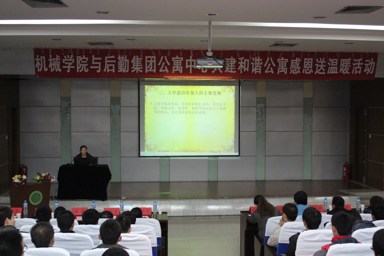活动中,丁里主任做了题目为《老员工宿舍安全》的报告,围绕防盗、防火等内容展开了详细的讲解,通过案例分析,指出了维护宿舍安全的几条措施。接着,汪副书记与田园主任为宿舍管理员代表赠送了公司受助贫困生的爱心纪念品。石处长代表后勤集团发言,他强调了宿舍安全的重要性,希望员工能够共同维持好自己的宿舍,重视宿舍安全。