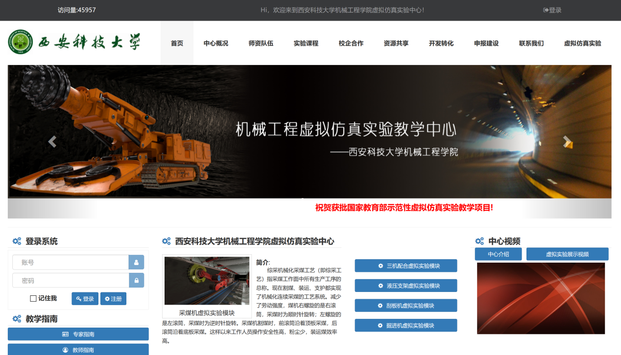 英国365集团实验中心最早可追朔到1958年的矿山机电实验室,2007年获批陕西省机械工程实验教学示范中心,2017年获批陕西省虚拟仿真实验教学中心,2018年“煤矿综采综掘机械虚拟仿真实验”获批教育部首批虚拟仿真实验教学项目。
