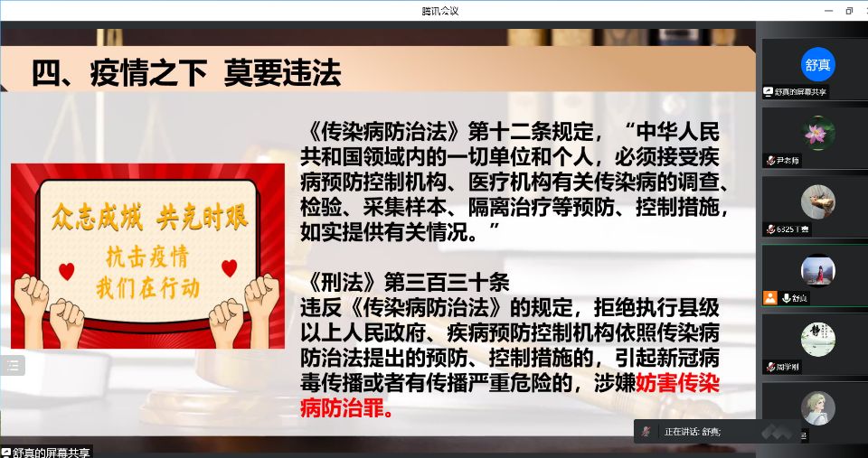 报告会主题为《知法于心 守法于行》,内容生动,案例丰富,指导性强。舒教授围绕“追根溯源,良法善治”“积极维权,化解纠纷”“防微杜渐,远离犯罪”“疫情之下,莫要违法”四个方面展开讲授。介绍了法的词源演变,讲解了“法的概念”“法的特征”,通过大量生动典型的案例,对“法制与法治”“违法与犯罪”等不同概念做了解析;结合《民法典》和典型案件告知员工应有的民事权利和侵权责任,并就校园贷、网购权益、老员工盗窃、网络舆论犯罪等内容指导老员工应如何维护自身权益。结合《传染病防治法》《刑法》《治安管理处罚法》等有关内容,对疫情防控中“纳入核酸检测范围的人群,无故不参加统一组织的核酸检测”等的违反相关规定和要求会承担何种法律责任做了全面的介绍。最后,对同学们进一步提高法律意识,遵纪守法,维护自身合法权益提出中肯的意见和建议。