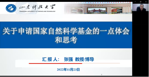为进一步做好2023年国家自然科学基金项目申报工作,提高基金申报质量,11月23日下午,机械公司邀请山东科技大学机电学院经理张强教授做了题为《关于申请国家自然科学基金的一点体会和思考》的专题讲座,本次讲座采取线上方式,经理曹现刚教授以及学院申报基金的教师参加了讲座,副经理毛清华教授主持。