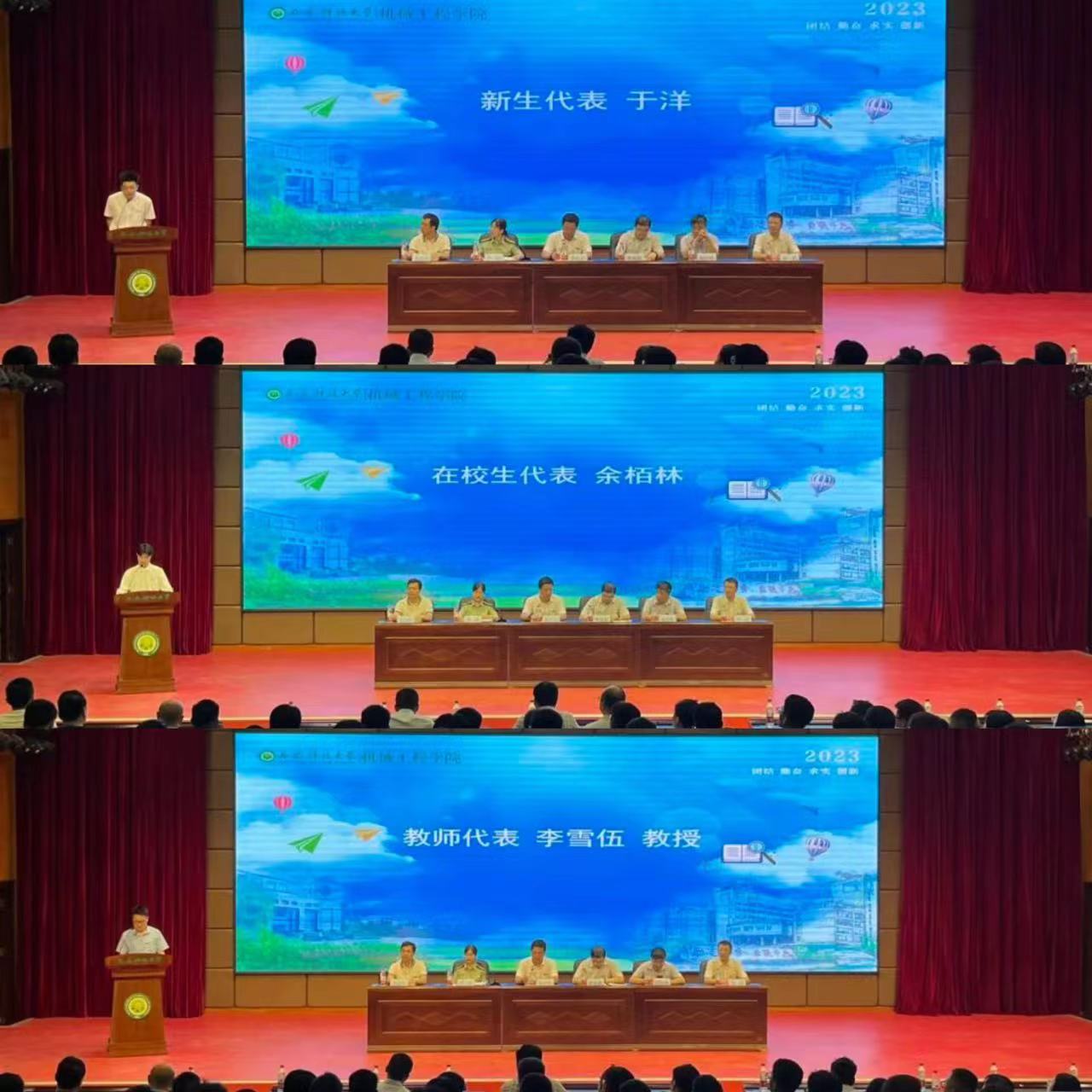 智能制造工程专业2023级于洋代表新生做出了珍惜美好学习时光,不负韶华的郑重承诺。机械电子工程专业2022级余栢林作为在校生代表分享了自己学习成长中的感悟和体会。23级班主任李雪伍教授代表教师发言,希望同学们立志奋发,坚强自信,拿出“天生我材必有用”的信心、“吹尽狂沙始到金”的毅力以及““直挂云帆济沧海”的勇气去迎接新的人生。