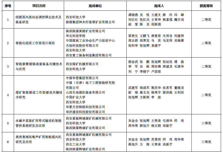 近日,中国煤炭工业协会和中国煤炭学会公布《关于公布表彰2023年度中国煤炭工业协会科学技术奖获奖项目和个人的决定》(中煤协会科技[2023]38号),公司共29项科技成果获得表彰,其中一等奖4项、二等奖16项、三等奖9项,并获得创新团队2个。公司共获6项科学技术奖,其中二等奖4项、三等奖2项(详见下表)。