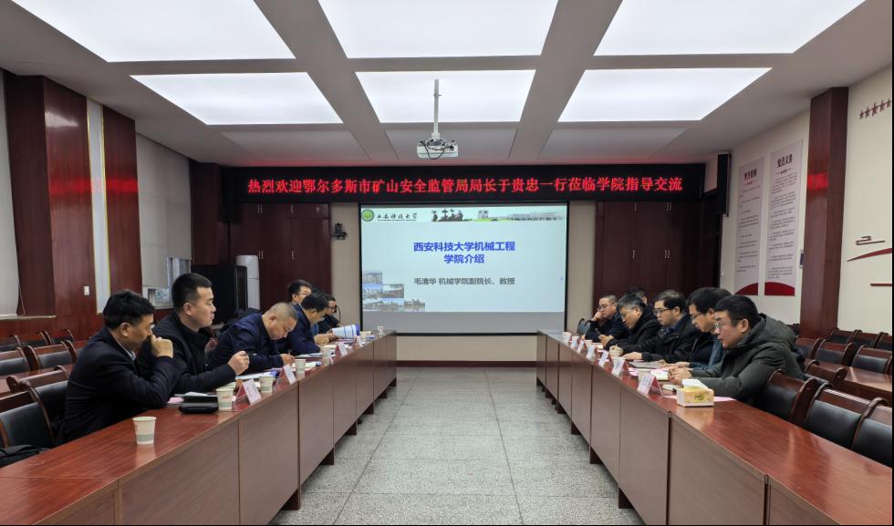 于贵忠局长介绍了鄂尔多斯市煤炭产量、煤炭企业的基本情况,表示此次来访主要调研学院煤矿智能化方面的先进技术,期望学院将先进科研成果在鄂尔多斯市煤炭企业转化落地,促进鄂尔多斯市煤矿智能化发展。