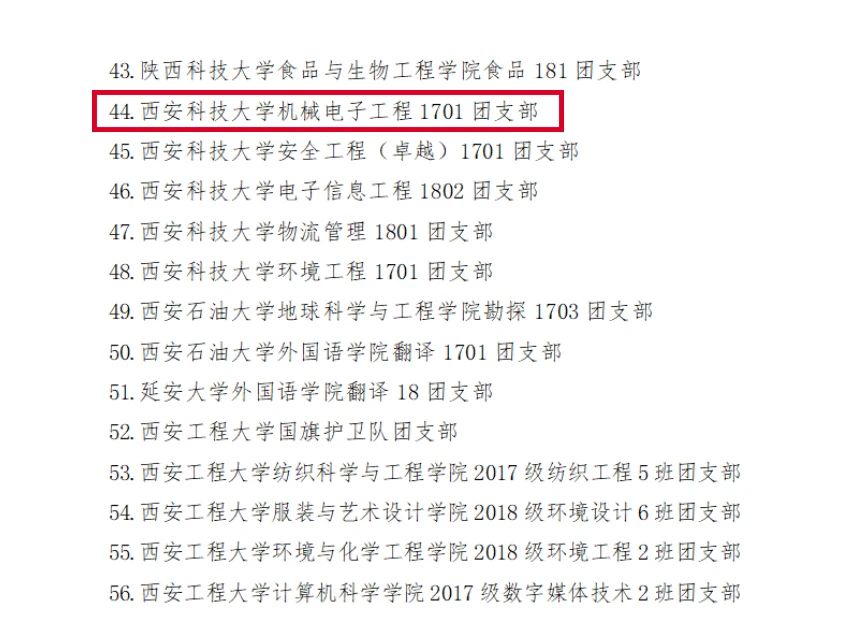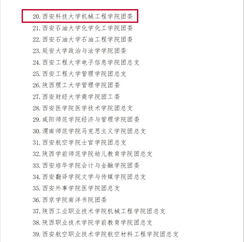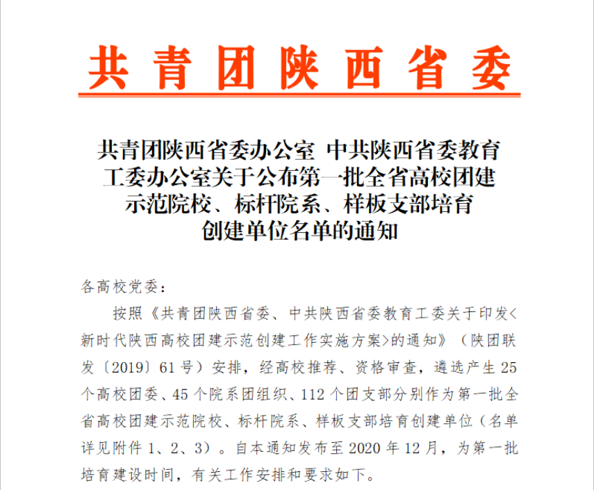 2020年5月13日,由共青团陕西省委办公室,中共陕西省委教育工委办公室公布的关于第一批全省高校团建示范院校,标杆院系,样板支部培育创建名单中,英国365集团团委被评为“全省高校团建标杆院系”。