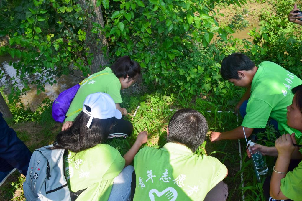 环保志愿者们按照蛇形布点法在长达两公里布满灌木丛的河岸带采集土壤。铁锹、掘根器、标本夹、吸水纸、采集带、GPS定位器、记录本、记号笔这些设备在队员手中逐渐熟练应用,一堂生动的户外操作课展开了。志愿者们从地表向下挖土30cm深,在坑壁采集没有被铁锹等金属接触的次一层土壤,装袋、标经纬度、表河道坡度……伏天的酷热没能抵挡住他们未环保贡献自己力量的初心。
